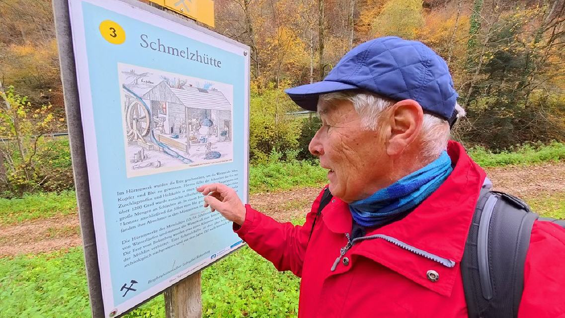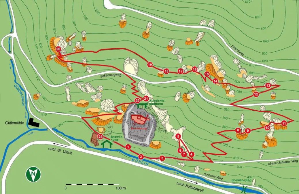 Station 1 Start und Parkplatz mit Plan des Bergbaureviers, 2 Erzaufbereitung, 3 Schmelzhütte, 4 Verhau, 5 Schacht und Radstube, 6 Bergbaulandschaft, 7 Schlackenhalde, 8 Stollenmundloch, 9 Bergschmiede, 10 Stollen und Schächte, 11 Köhlerplatz, 12 Alte Wegspur, 13 Wohn- und Arbeitsplatz, 14 Das Scheiden der Erze, 15 Mittelalterliche Müllhalde, 16 Unter Tage, 17 Silber - Kupfer - Blei, 18 Archäologie, 19 Holzriese, 20 Pingen, 21 Erzminerale, 22 Birchiburg, 23 Staudamm.