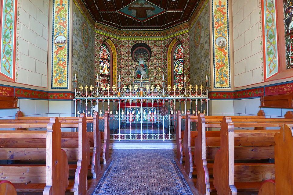 So markant die Kapelle über dem Dreisamtal und insbesondere am Eingang zum Wagensteigtal thront, so beeindruckend ist auch ihre Innenausstattung. Besonders auffallend sind die farbigen Glasfenster.