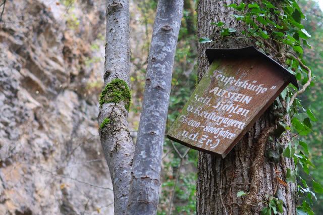 Zuletzt bietet der Steinpfad eine weitere Attraktion, die nicht unerwähnt bleiben sollte: die Überreste der Burg Hauenfels (Station 9) , wo Ritter und Mönche wohnten und Räuber hausten. Die kleine Ruine liegt sich an den östlichen Felshängen des Ölberges zwischen den Steinzeithöhlen. Ihre Geschichte ist weitgehend unerforscht. Gerätselt wird, ob es sich bei dem festen Bauwerk überhaupt um eine Burganlage handelt. Eine mögliche Ersterwähnung als „Huwensteine“ in einer Urkunde des Klosters St. Ulrich ist auf das Jahr 1316 datiert. Funde von der Burgstelle deuten auf einen Nutzungszeitraum vom 13. bis ins frühe 16. Jahrhundert hin. Die Burg, die nahegelegene Felsenmühle und der Weiler Gütighofen dürften eine kleine Wirtschaftseinheit im Mittelalter gebildet haben.