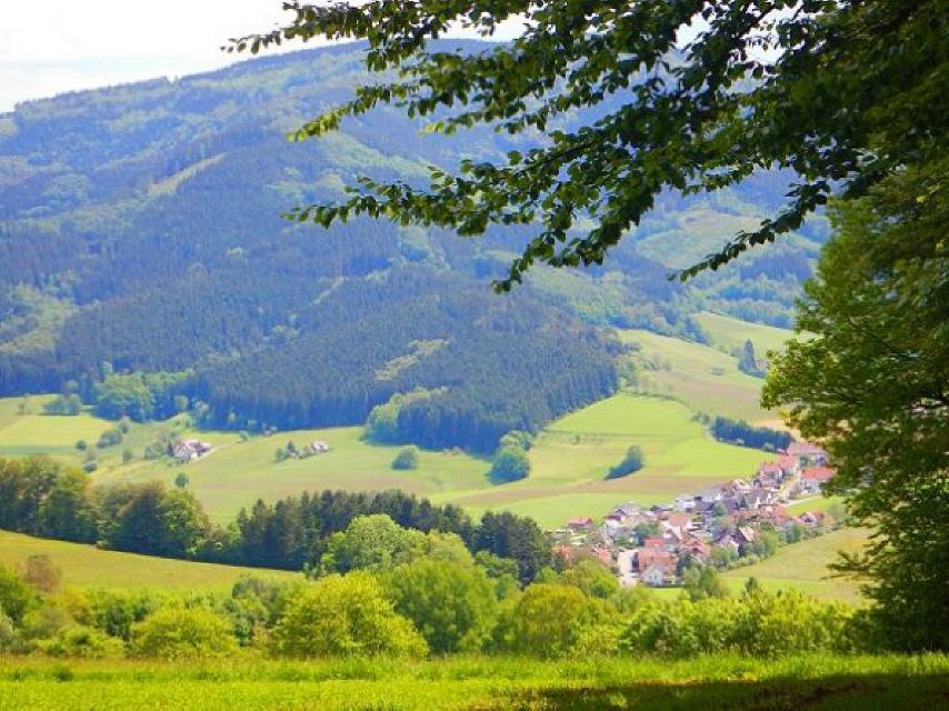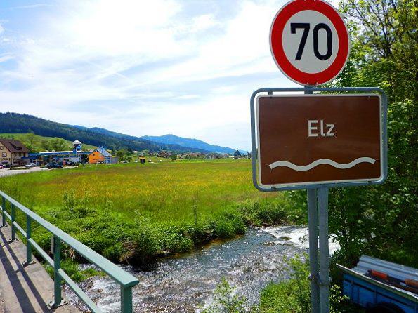 Gleich dahinter steigen wir durch den Wald zur Elz hinab, folgen dem Flüsschen aufwärts bis zur Überquerung bei den Schrahöfen. Dort dem Hinweisschild folgen, die Schule und das Rathaus passieren und steil den Berg hinauf. Oben gönnen wir uns erst einmal eine Rast und blicken ins Elztal hinab.