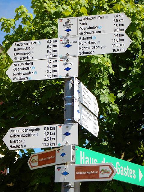 Der Rundwanderweg Goldener Kopf in Elzach im Elztal misst rund 11 km und führt 411 m auf und ab. Der höchste Punkt liegt auf 514 m, der tiefste auf 354. Laut Prospekt macht gerade das Wechselspiel diese Tour so interessant; die abwechslungsreiche Wanderung zeichnet sich mit wenigen und kurzen Anstiegen aus. Naja, ganz so stimmt das nicht. Wir haben die Tour ausprobiert. Sie bietet zwar herrliche Aus- und Fernsichten sowie wunderschöne Höhenwege, aber ein Klacks ist die Tour sicherlich nicht. Wanderschuhe sind ebenso erforderlich wie eine gute Kondition. Ohne Pause ist die Rundwanderung in gut drei Stunden zu schaffen.