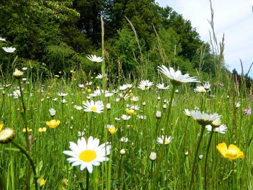 Nach der erfrischenden Pause führt uns der Weg (gelbe Raute) am Burgersberg vorbei über Höhenwiesen mit einer wunderschönen, freien Höhenlandschaft mit Wiesen und schönen Weiten.