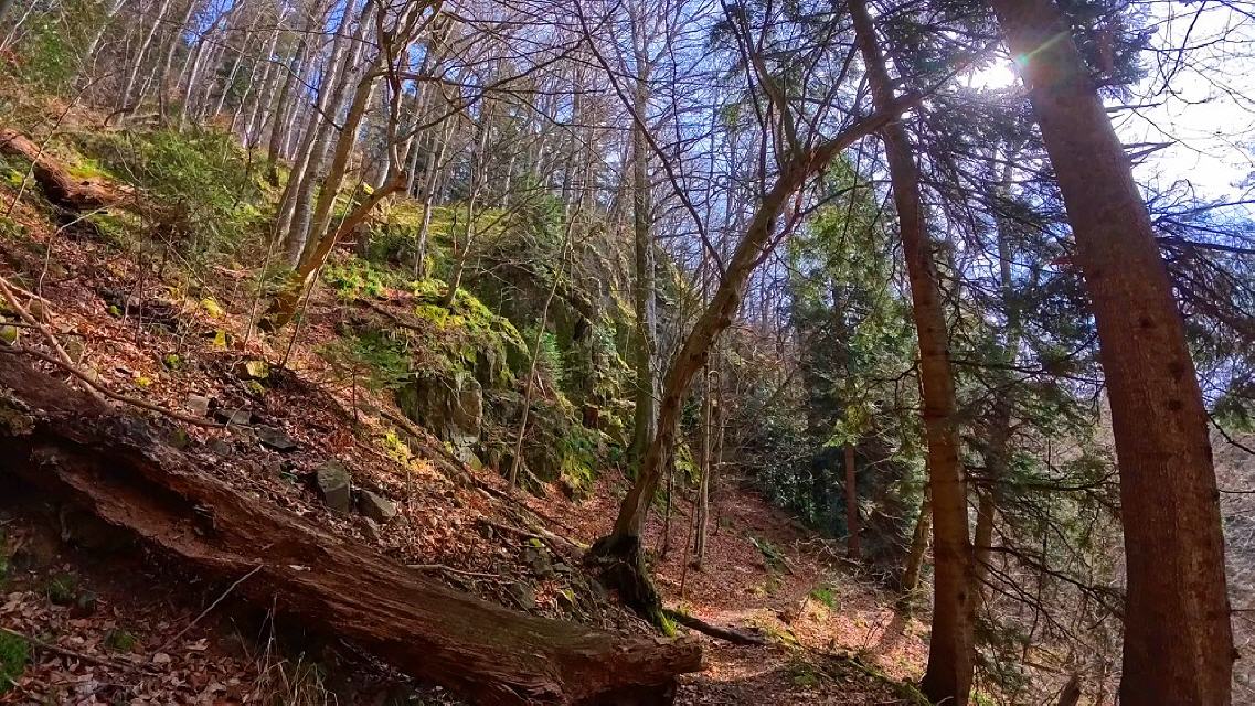 Station 7: Der Verlauf des Urgrabens vom 22 km entfernten Platten am Osthang des Kandel hatte seinen Grund, denn auf dieser Seite des Bergmassives fehlte das benötigte Wasser. An diesem Standort führt der heutige Wanderweg exakt auf der Trasse des ehemaligen Wassergrabens - und dieser musste damals kunstvoll um die Felsvorsprünge herumgeführt werden. Die Breite des Urgrabens betrug maximal einen halben Meter.