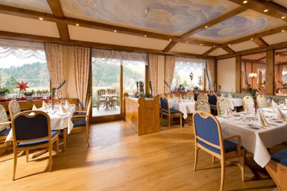 St. Georg Stube. Unser stilvolles á la carte Restaurant “St. Georgs Stube” wurde nach dem Hl. St. Georg, dem Bleibacher Schutzpatron, benannt. Die Heiligenfigur im Restaurant ist eine Leihgabe der Kirchengemeinde und stand lange Jahre in unserem Gotteshaus. Die Wandbilder aus der Sage vom Silberkönig stammen von dem Bleibacher Künstler Hans Schätzle. Der Raum bietet Platz für 50 Personen.