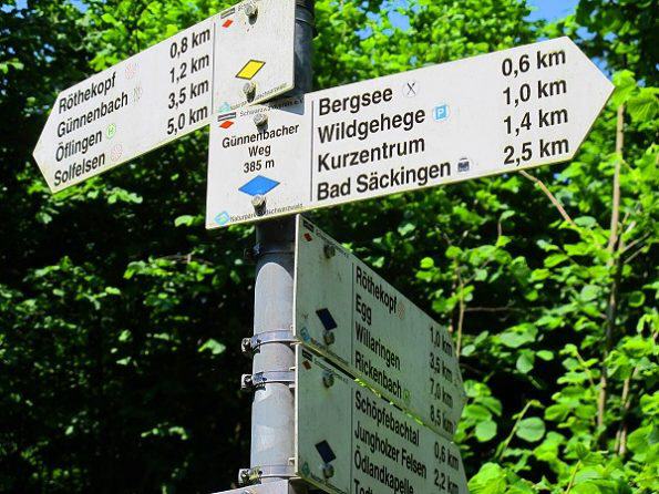 Beginnen wir die vier- bis fünfstündige Bergtour beim Bad Säckinger Bahnhof und folgen von dort aus der blauen Raute des Schwarzwaldvereins sowie dem blauen “Ö” auf weißem Grund (Ökopfad) über die “Badmatte” und das “Kurzentrum” durch die Stadt.
