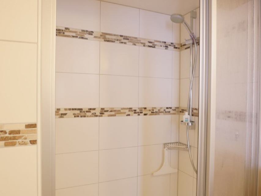 Dusche/WC mit Handtücher, Duschtücher, Föhn