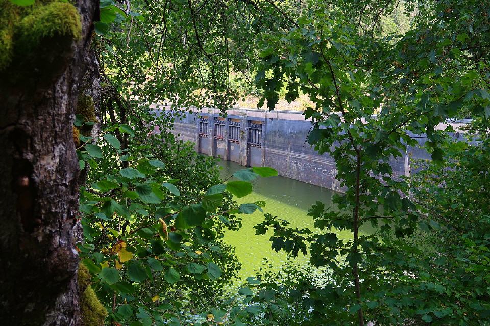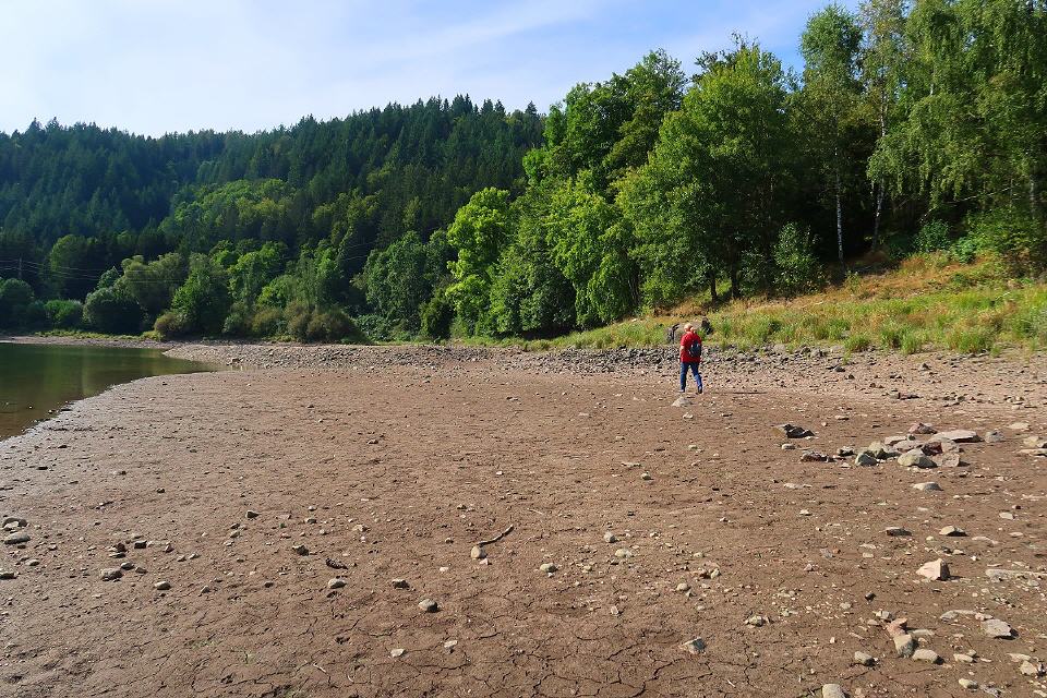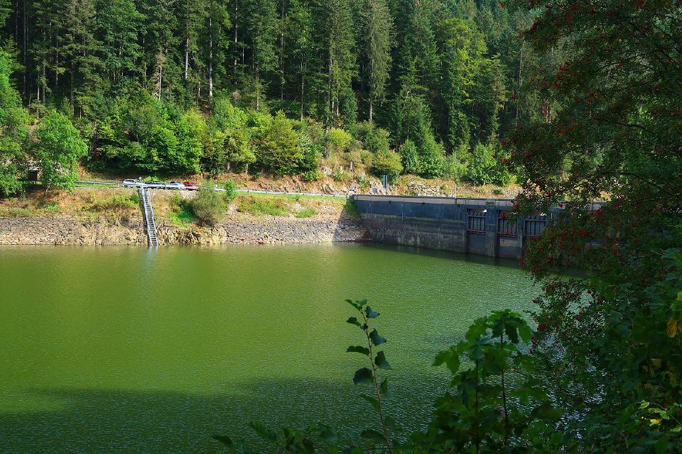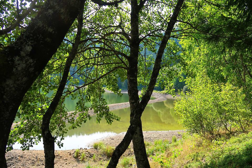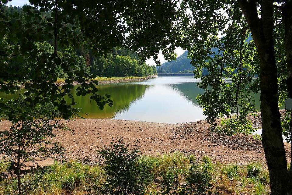 Dann bleibt man auf der rechten Seite des Ufers und beginntden See zu umrunden. Wenig später erreicht man eine Kneipp-Anlage am Albstausee, die versteckt im Wald einen Blick auf den See gewährt. Hier kann man die Füße im Wasser abkühlen und die Waldluft genießen. Erholt geht es weiter den Seerundweg entlang bis zur Staumauer.