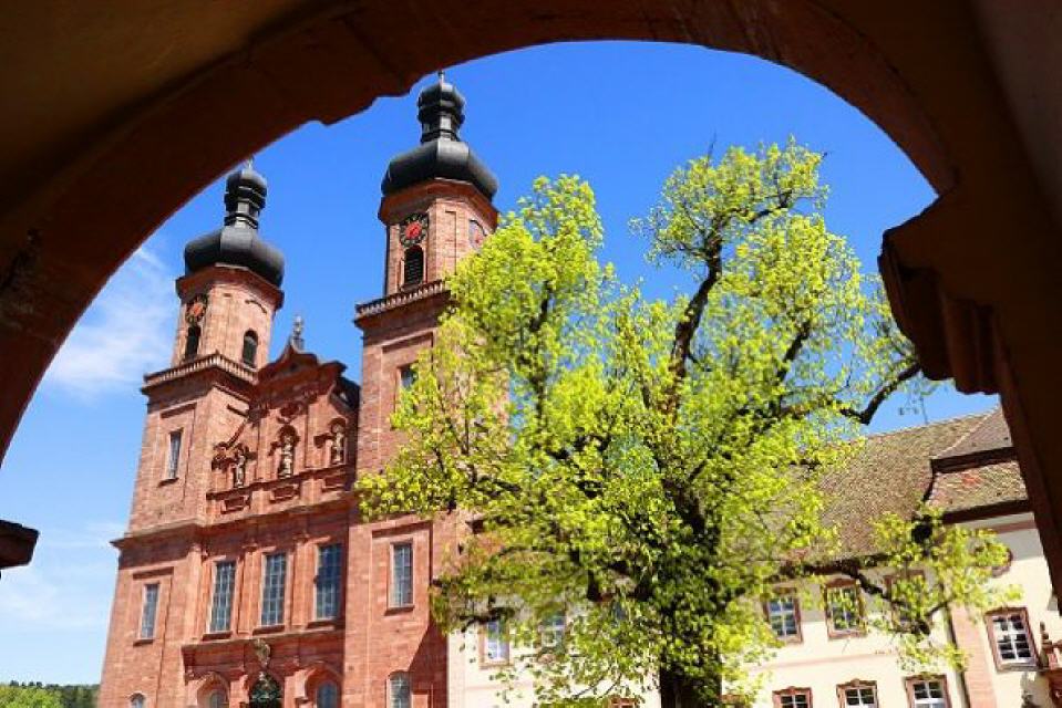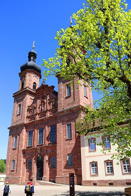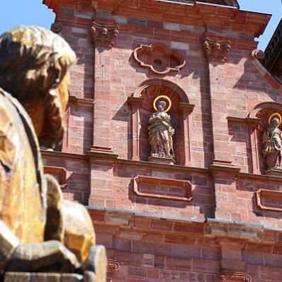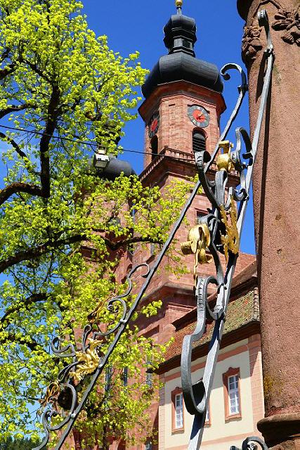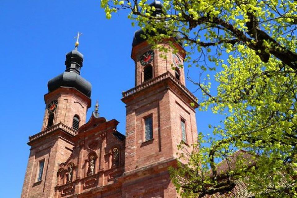Kommt man von Freiburg durch das Eschbachtal herauf, sieht man schon von weitem die prächtige Rotsandsteinfassade der Kirche in Sankt Peter mit ihren doppelten Zwiebeltürmen und der klassischen horizontalen und vertikalen Dreigliederung, in die die Figuren des Heiligen Petrus, Benedikt und Ursula eingestellt sind.