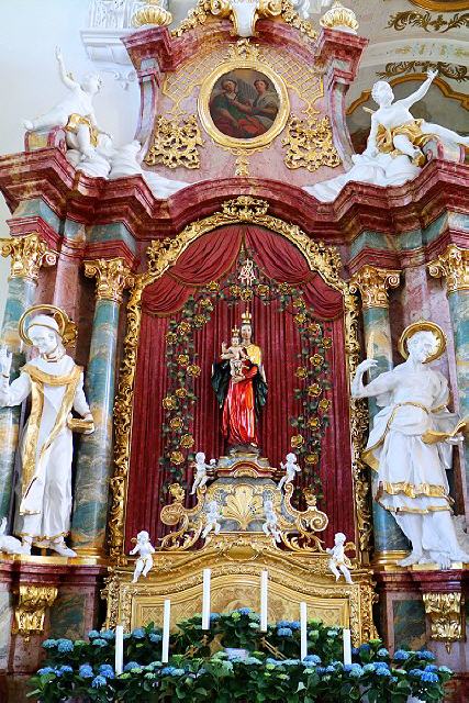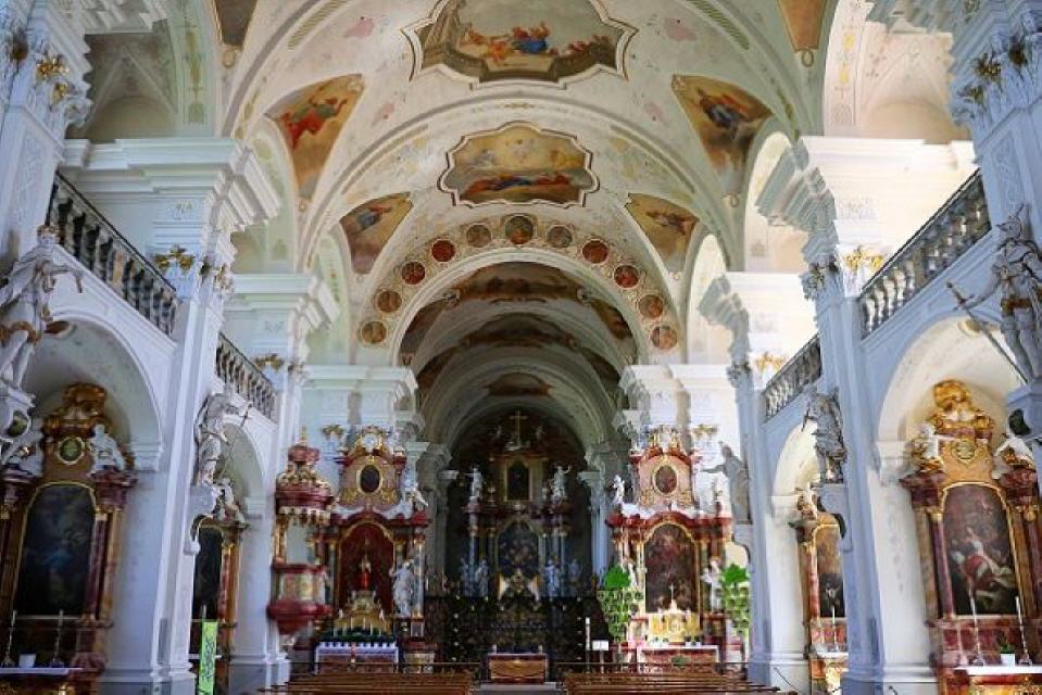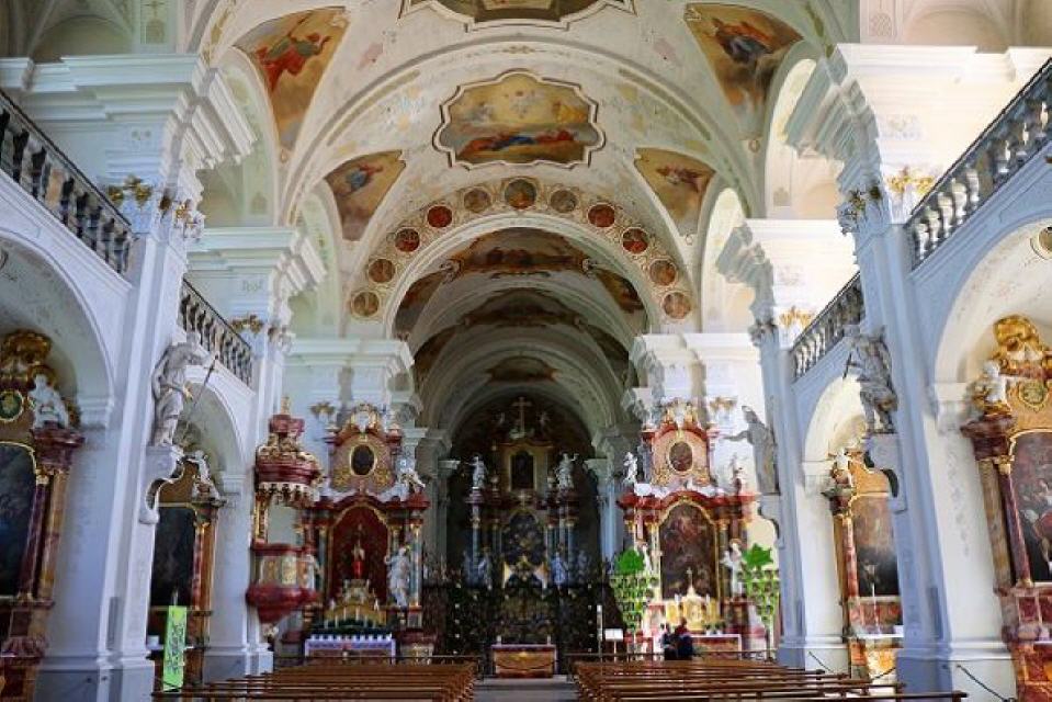 Beim Betreten der einschiffigen Kirche entfaltet sich die Pracht des «himmlischen Thronsaales», die mit ihrem Lichtspiel und den Details der Ausstattung zum Hochaltar als Abbild des Thrones Gottes und damit zum Ziel einer Wegkirche hinführt.