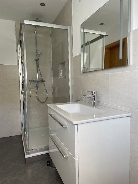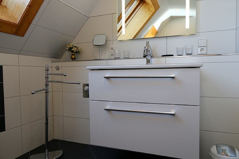 Bad/Dusche, WC, Föhn, Kosmetikspiegel.