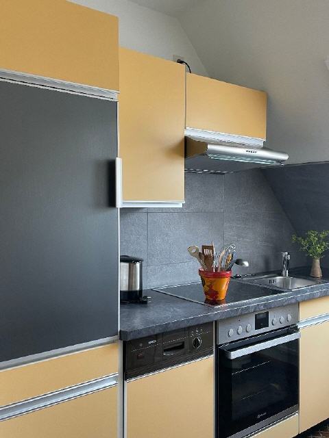 Küche mit Elektroherd, Dunstabzug, Backofen, Mikrowelle, Spülmaschine, Kühlschrank, Gefrierfach, Handmixer, Eierkocher, Toaster, Wasserkocher und Kaffeemaschine.