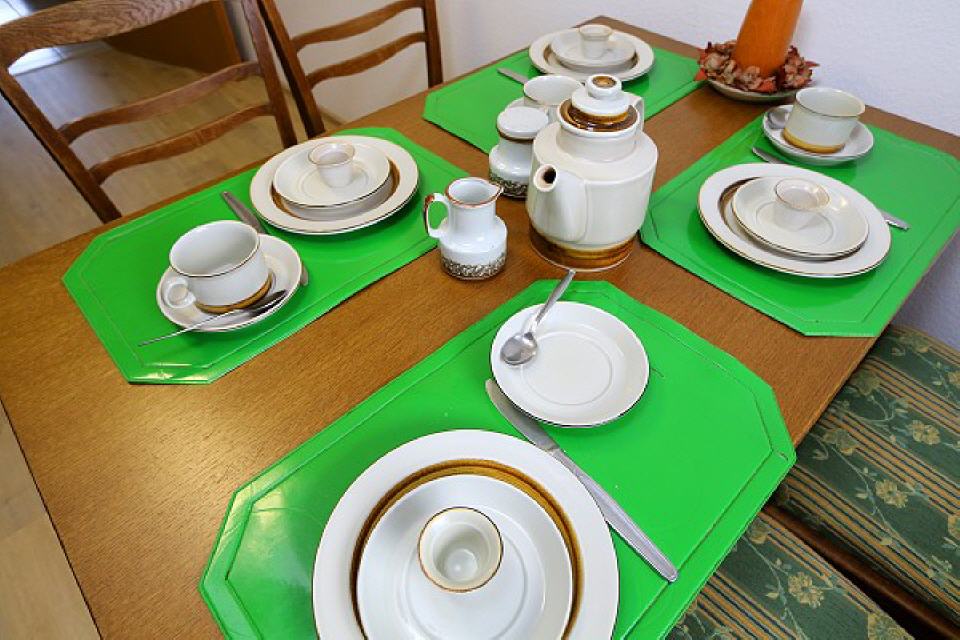 Küche mit Essplatz, Elektroherd, Dunstabzug, Backofen, Mikrowelle, Spülmaschine, Kühlschrank, Gefrierfach, Handmixer, Eierkocher, Toaster, Wasserkocher und Kaffeemaschine.
