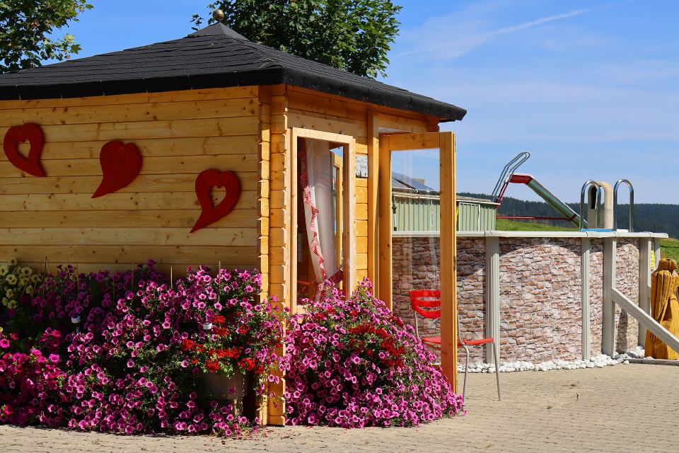 - Und wenn Sie einfach mal ein paar Stunden hier bei uns am Haus verbringen möchten, steht Ihnen ein gemütlicher Sitzplatz mit Tisch, Stühlen sowie Liegen zur Verfügung. Für unsere Feriengäste haben wir im Sommer einen kleinen, beheizten Außenpool. Darin können Sie auch nach einer Wandertour entspannen und sich erfrischen. Die Kinder können sich unbeschwert auf dem Spielplatz mit Rutsche tummeln.