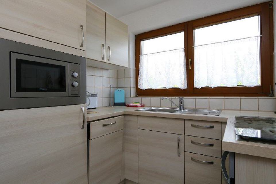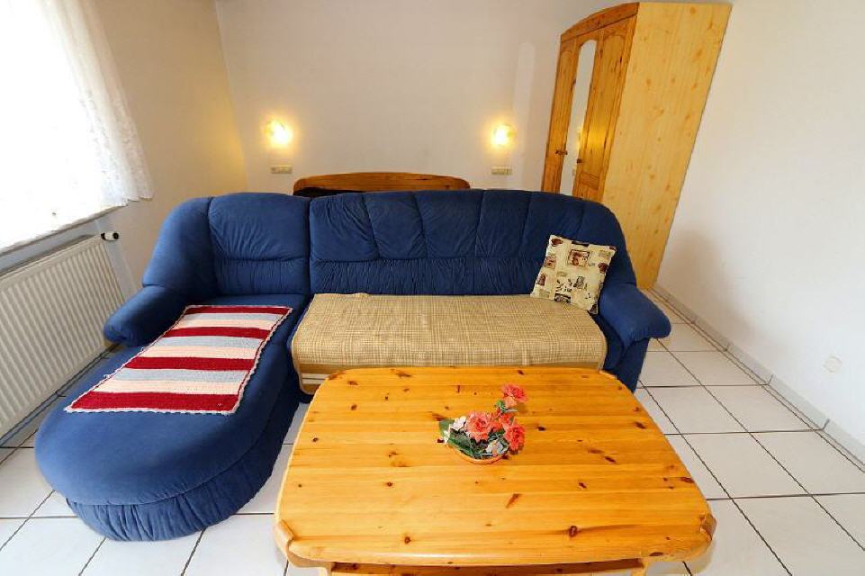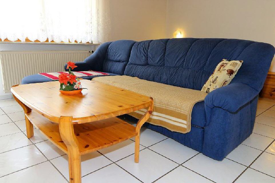 Auch diese Ferienwohnung liegt ebenerdig und hat einen separaten Eingang. Die Fewo hat eine Wohnfläche von 67 qm und bietet Platz für bis zu 5 Personen. Die Fenster haben Rolläden. Die moderne Einbauküche verfügt über Essecke, Mikrowelle Toaster Elektro- und Holzgrill. Das Bad mit Dusche hat Badewanne mit Haltegriffe, WC und Waschmaschine. Genießen Sie Ihren Urlaub auch auf der großen Terrasse, freuen Sie sich auf die Spiel- und Liegewiese mit Liegestühle und Gartenmöbel. Das Wohnzimmer hat Ess- und Couchecke, die eine weitere Schlafmöglichkeit bietet. Ihnen steht ein Sat-TV zur Verfügung. Die Wohnung hat 2 Schlafzimmer: