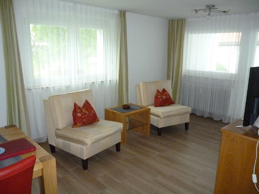 Wohnzimmer: 2 gemütliche Sessel, Tisch, Schrank, Kabel-TV, Balkon, Gartenblick, Gartenmöbel,