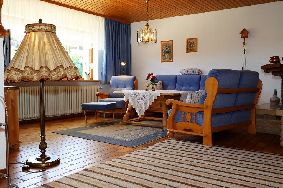 - Wohn- / Esszimmer: gemütliche Couchgarnitur, Tisch, Sessel, Sat-TV (Flachbildschirm), CD und DVD-Player, Radio, Schrank (Kommode), Sitzecke mit Eckbank und Stühlen, Ausgang zur Terrasse und zum Garten