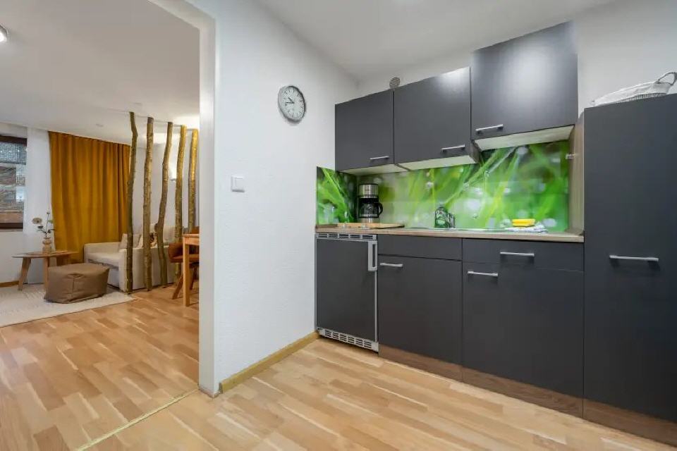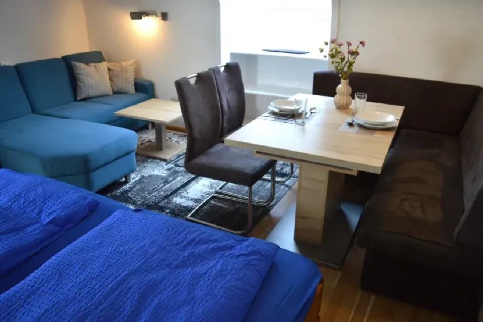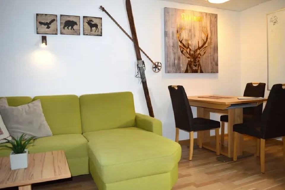 SN - „Schwalbennest“ für 2-3 Personen mit Balkon: Schickes Apartment für 2 Personen, 1 Wohnzimmer mit Flachbild-TV 55”, Radio, Sofa mit Schlaffunktion, Esstisch mit 4 Stühlen, Schlafzimmer mit Boxspring-Doppelbett und Kleiderschrank, Tageslicht-Küche, mit Mikrowelle, Spülmaschine, 4-Plattenherd und Backofen, Wasserkocher, Kaffeemaschine, Toaster, Duschbad / Toilette mit Fön, Süd-Balkone mit schöner Aussicht Richtung Radon-Vitalbad und Wildpark