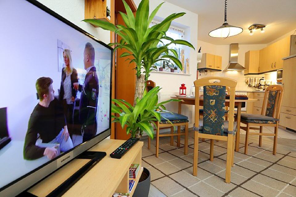 Die Ferienwohnung bietet auf 70 qm genügend Platz für Ihre Familie; sie verfügt über einen eigenen Eingang. Das Schlafzimmer ist modern möbeliert. Die Betten verfügen über einen am Kopf- und Fußteil höhenverstellbaren Lattenrost. Kinderbett ist vorhanden. Der Wohnbereich ist sehr gemütlich ausgestattet und bietet: Sat-TV, Radio, Sitzgruppe, Schlafsofa und eine Essecke mit Stühlen. Modern, bestens ausgestattet und zweckmäßig ist auch die Kücheneinrichtung mit Geschirrspühler, Mikrowelle, Ceran-Kochfeld, Backofen und Grill.