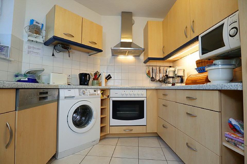 Küche komplett ausgestattet mit Kaffeemaschine, Toaster, Wasserkocher, reichlich Geschirr