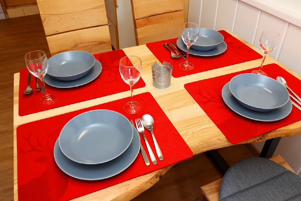 - Backofen, Kühlschrank mit Gefrierfach, Spülmaschine, Kaffeemaschine, Kaffeemaschine Tassimo, Mikrowelle, Wasserkocher, Esstisch für 4 Personen
