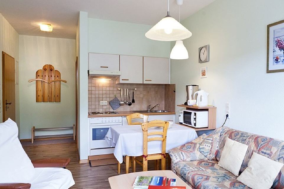 Wohn-/Esszimmer mit Küchenzeile: Komplett eingerichtete Küche: 4-Plattenherd, Backofen, Filterkaffeemaschine, Wasserkocher, Toaster, Mikrowelle, Mixe,Esstisch und 4 Stühle, Sofa, Wohnzimmertisch, SAT-TV, Radio mit CD-Player.