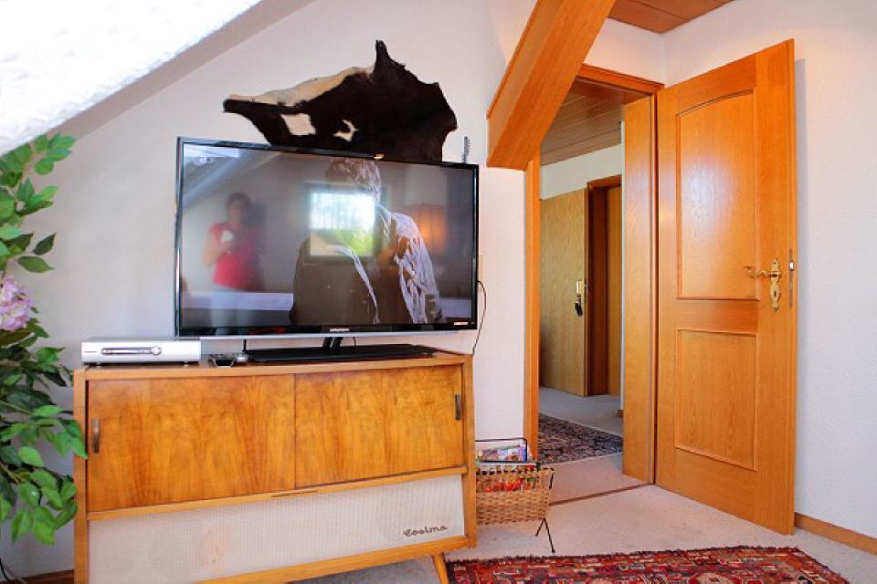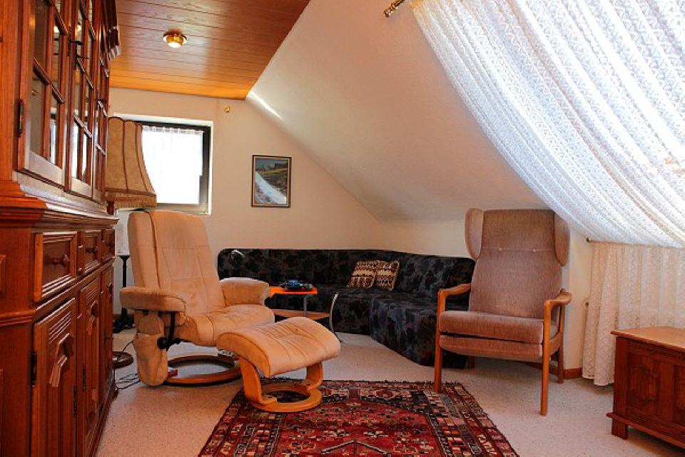 Die Ferienwohnung verfügt über ein großes, gemütlich eingerichtetes Wohnzimmer mit Sat-TV und Radio, einem bequemen, großen Sofa, das als zusätzlicher Schlafplatz für zwei Personen genutzt werden kann (2×2 m).
