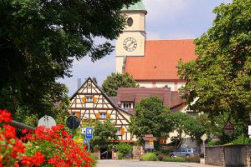 Pfarrkirche Kirche St. Leodegar in Schliengen. Das weite, lichtdurchflutete Kirchenschiff und der 5seitige Chor wurden 1752-55 erbaut, während der in die volutengeschmückte Westwand einbezogene Turm in den drei unteren Geschossen von der romanisch/gotischen Vorgängerkirche stammt. Das 4. Turmgeschoß mit seinen abgeschrägten Ecken und doppelovalen Klangfenstern entstand wie das Schiff in der Barockzeit, der geknickte Turmhelm erst später. Im Innern zeigen die Seitenaltäre sowie die Kanzel Rokokostil. Die Figuren der Heiligen Barbara und Katharina von J. M. Winterhalter gelten als kunstgeschichtlich erstklassig.