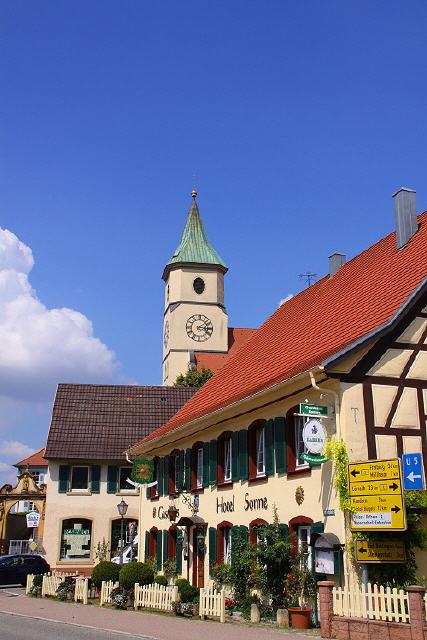 Das markante, weinrote Gebäude steht am Ortsausgang Richtung Müllheim. Sehenswert ist im Ortszentrum das Wasserschloss “Entenstein”, das heute als Rathaus genutzt wird. Im Frühling empfiehlt sich ein Abstecher in das Eggener Tal, wenn sich die Landschaft am Fuße des Blauen in ein Meer blühender Kirschbäume verwandelt. Der Tipp: unbedingt den Fotoapparat mitnehmen. Denn die Fülle an blühenden Kirschbäumen ist einmalig. Oberhalb des Tales und von weitem sichtbar sind weitere Sehenswürdigkeiten: das berühmte Schloss Bürgeln sowie die Ruine Sausenburg.