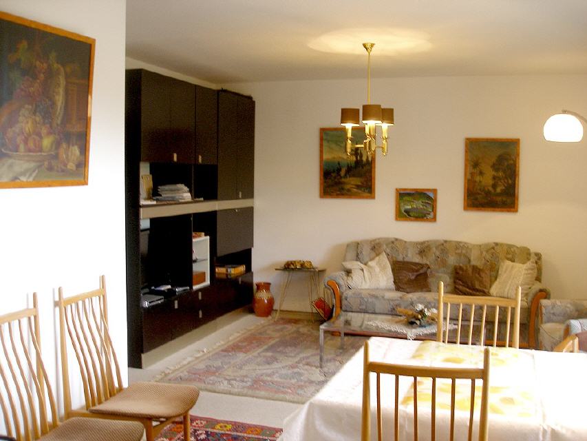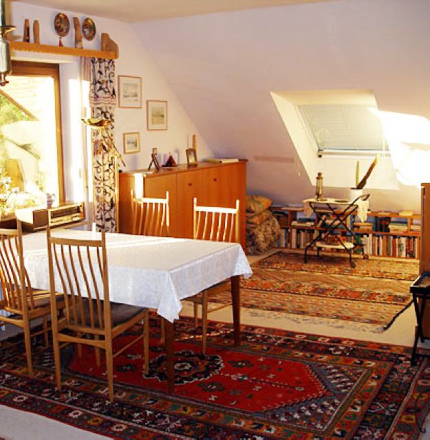 Für das gemütliche Gespräch oder den Genuss des Fernsehens steht eine Couch mit Sessel parat. Der Blick vom großen Tisch über die Dächer, verbunden mit der Ruhe, verführen zum Lesen und Relaxen. Bücher sind reichlich dafür vorhanden. Im großen, hellen Schlafzimmer kann man zwei oder nur ein Bett aus der großen Schrankwand klappen und liegt dort wie in den verborgen Betten des Wohnzimmers auf guten Matratzen bei Bedarf mit Überlänge. Die geräumige Schrankwand bietet viel Platz. Zudem stehen noch zwei kleine Sessel parat.