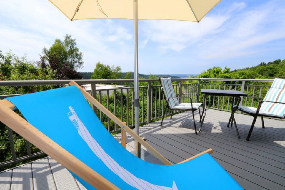 Balkon: 2 Sessel mit Auflagen, Liegestuhl, Tisch, Sonnenschirm