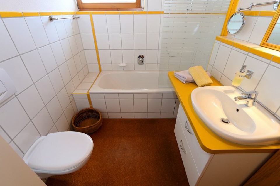 Tageslicht-Badezimmer: WC, Waschbecken, Duschvorrichtung in Badewanne, Badezimmerschränke