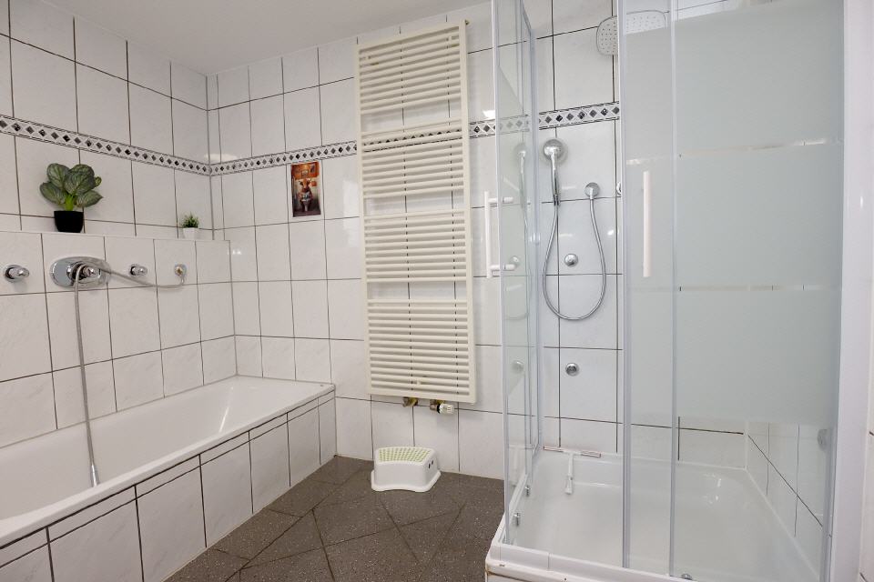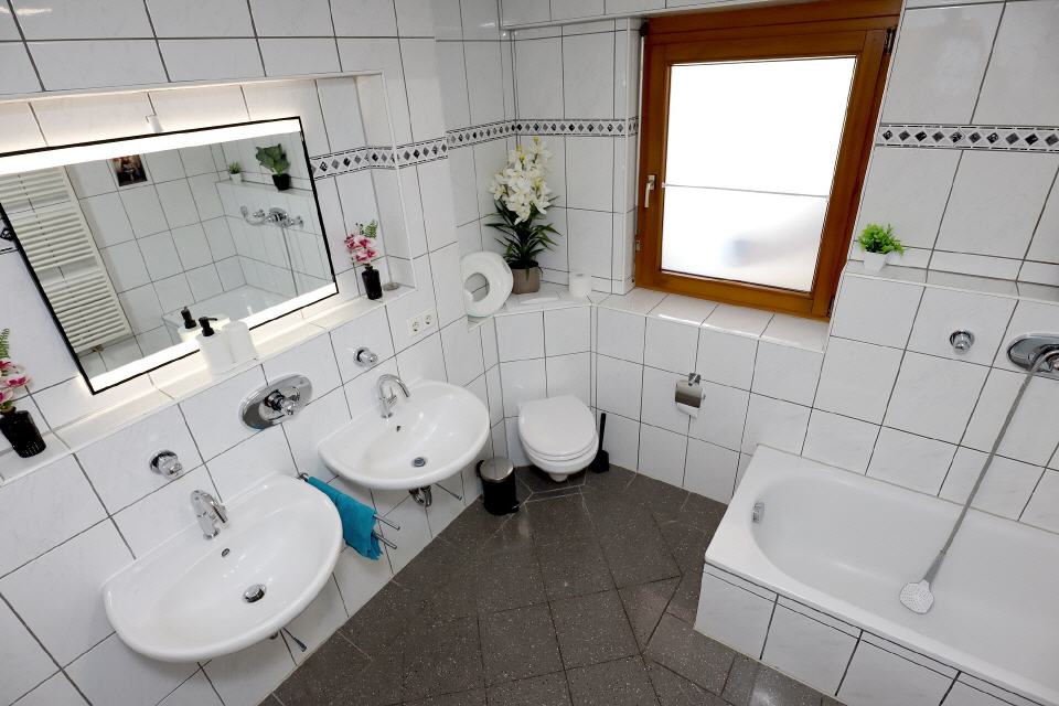 - Sanitär: Dusche, Spiegel, WC, Handtücher, Föhn, Waschbecken