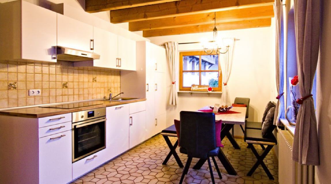 1 Wohnküche mit Küchenzeile, Esstisch, Eckbank und Stühle