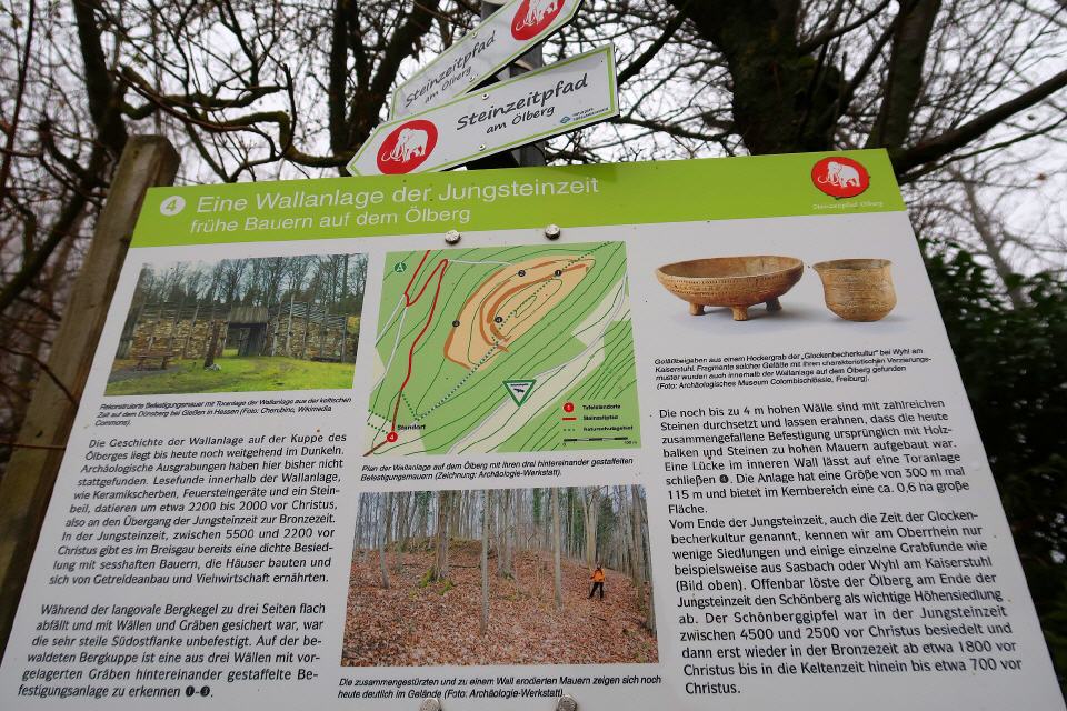Eine weitere historische Sehenswürdigkeit liegt auf der Kuppe des Ölberges (Station 4). Der Rundweg führt direkt daran vorbei. Die Geschichte der Wallanlage liegt bis heute noch weitgehend im Dunkeln. Archäologische Ausgrabungen haben hier noch nicht stattgefunden. Lesefunde innerhalb der Wallanlage, wie Keramikscherben, Feuersteingeräte und ein Steinbeil, datieren um etwa 2200 bis 2000 vor Christus, also am Übergang von der Jungsteinzeit zur Bronzezeit. In der Jungsteinzeit, zwischen 5500 und 2200 vor Christus, gibt es im Breisgau bereits eine dichte Besiedlung mit sesshaften Bauern, die Häuser bauten und sich von Getreideanbau und Viehwirtschaft ernährten.