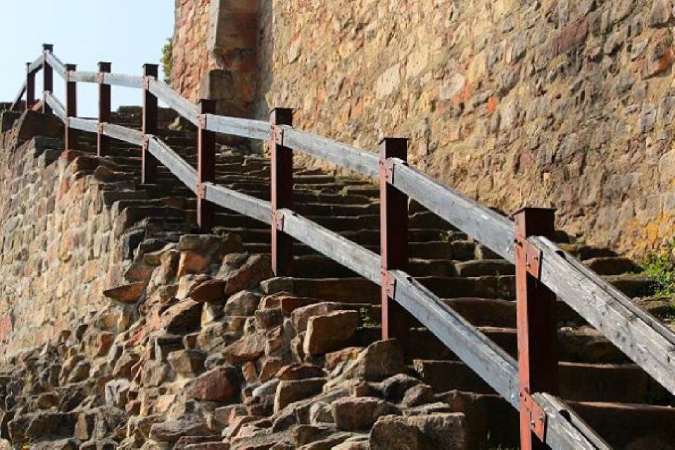 Zwischen dem gemauerten Unterbau und der daraufgesetzten Erdböschung waren horizontal sogenannte Sturmpfähle eingelegt, die auskragend ein Besteigen der Festungswände verhindern sollten. Auf ein besonderes Detail sei noch hingewiesen.