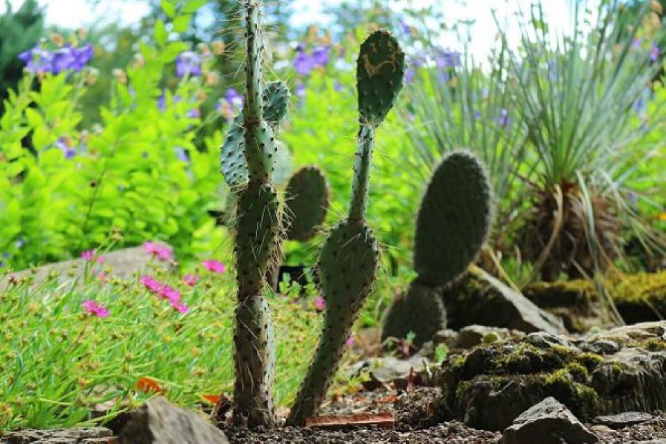 Sukkulenten-Schaugewächshaus: Das Sukkulenten-Schaugewächshaus bietet Gelegenheit zu beobachten, wie Pflanzen aus unterschiedlichen Verwandtschaftsgruppen in Anpassung an bestimmte Umweltbedingungen ganz ähnliche Formen entwickelt haben (Konvergenz). Die hier ausgestellten Kakteen und Wolfsmilchgewächse und Vertreter anderer Familien haben sich hinsichtlich ihrer Formen, Strukturen und Physiologie an trocken-heiße Standorte angepasst. Die Fähigkeit zur Wasserspeicherung macht einige dieser Arten zu wertvollen Nutzpflanzen.
