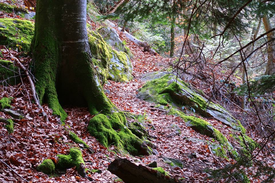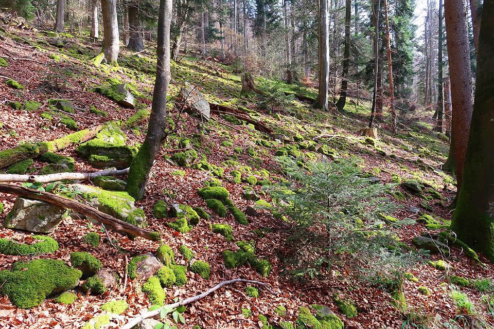 Station 7: Der Verlauf des Urgrabens vom 22 km entfernten Platten am Osthang des Kandel hatte seinen Grund, denn auf dieser Seite des Bergmassives fehlte das benötigte Wasser. An diesem Standort führt der heutige Wanderweg exakt auf der Trasse des ehemaligen Wassergrabens - und dieser musste damals kunstvoll um die Felsvorsprünge herumgeführt werden. Die Breite des Urgrabens betrug maximal einen halben Meter.