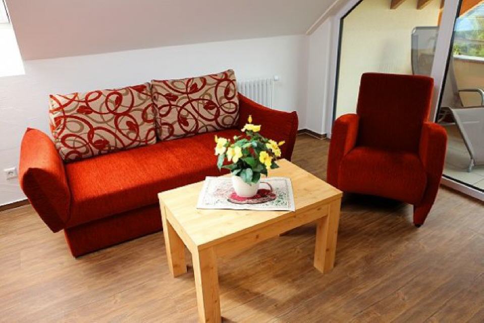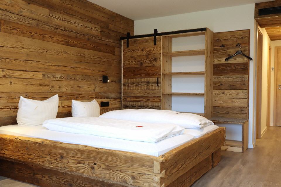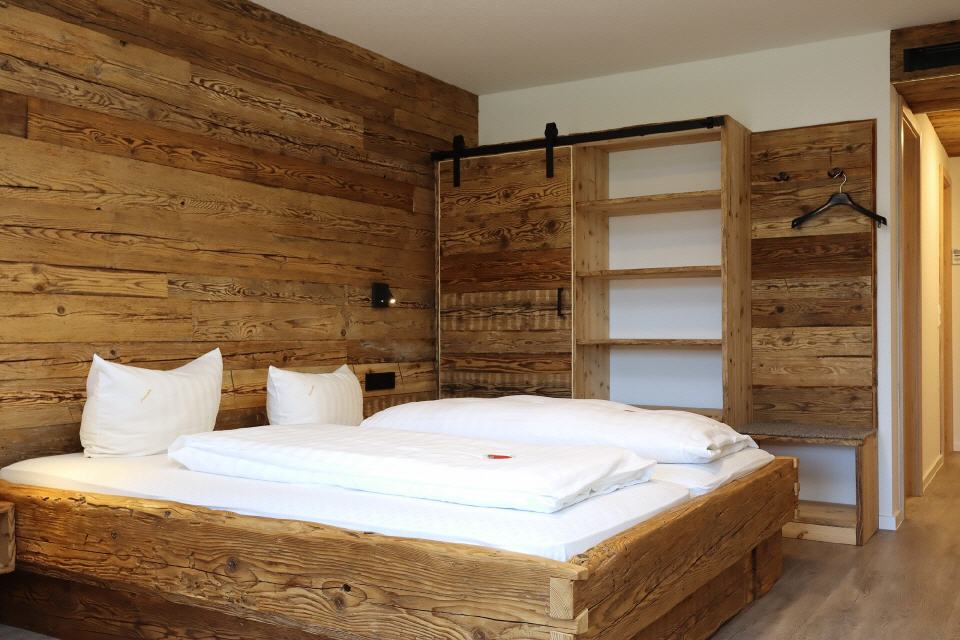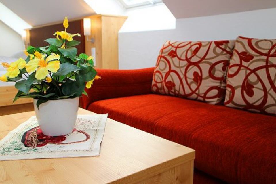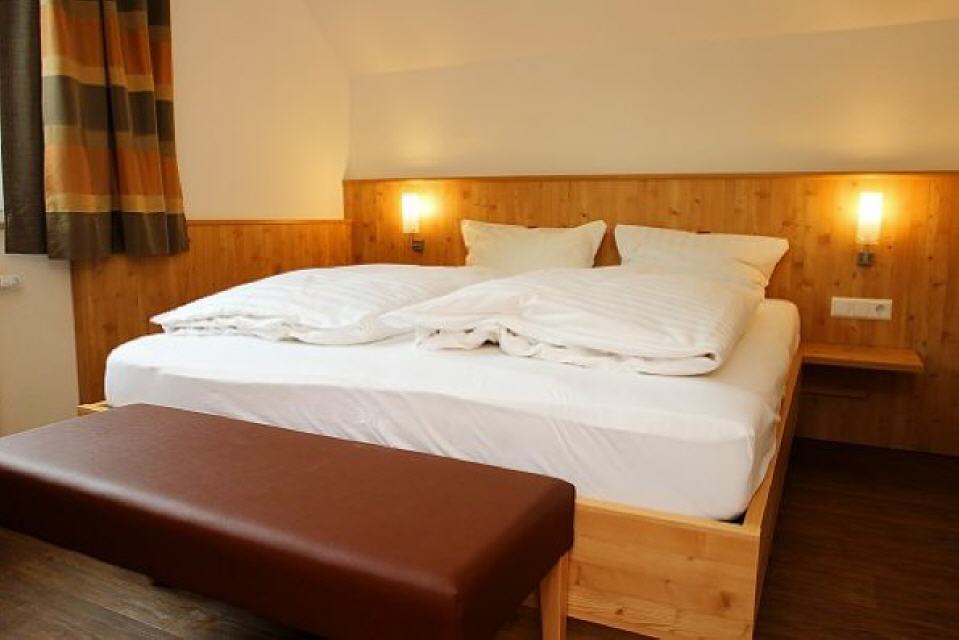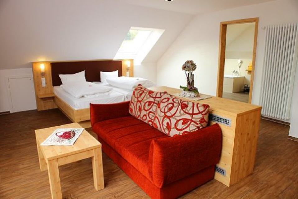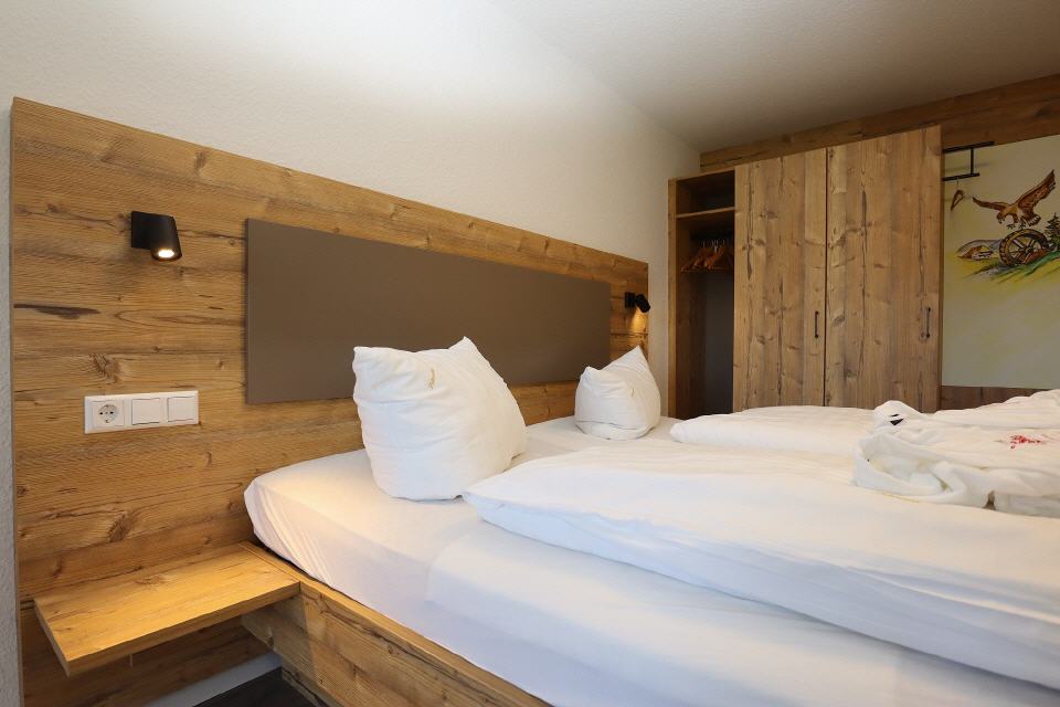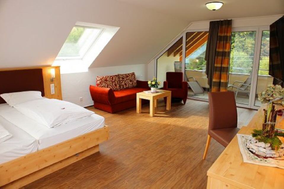 - Suite "Adlerhorst", 62 qm ist für bis zu 4 Personen und mit 2 Zimmer mit je einem Doppelbett, ausgestattet, sowie Badezimmer mit begehbarer Dusche, WC, Haarfön, Kosmetikspiegel, Safe, Minibar, Sat-TV, Internet WLAN (kostenfrei), gemütliche Wohnecke und Balkon mit herrlichem Ausblick zu den grünen Wiesen nahe des Waldes und dem Frischnaubächlein. ab 72 € *