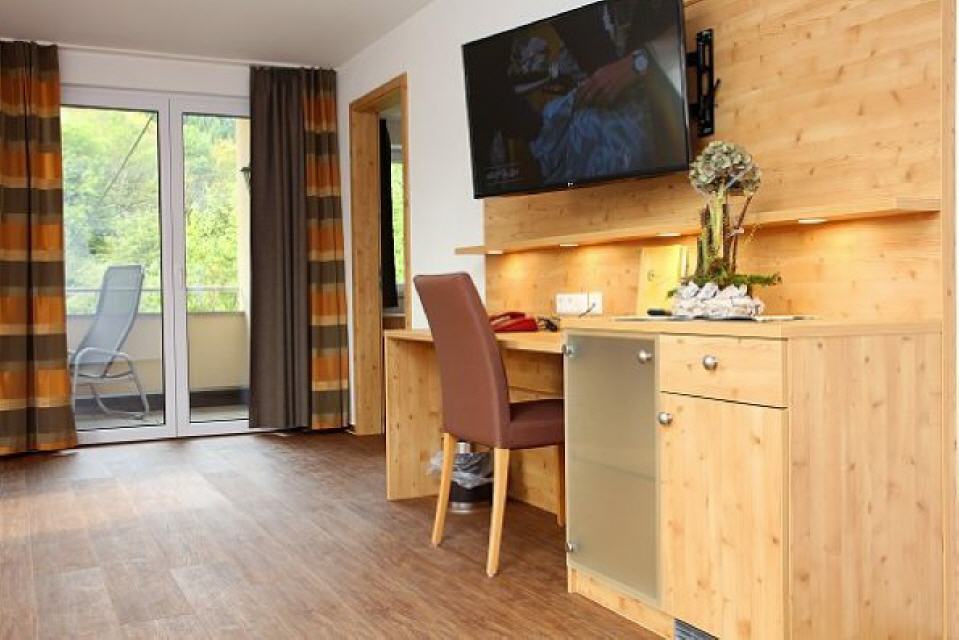 - Barrierefreies Einzeimmer "Deluxe", 43 qm, im Sonnenflügel mit Badezimmer, teilw. mit Doppelwaschbecken, Dusche, Haarfön, Kosmetikspiegel, WC, Telefon, WLAN (kostenfrei), Sat-TV, Minibar, Safe, gemütliche Wohnecke, Terrasse oder Südbalkon mit herrlichem Ausblick zu den Schwarzwaldbergen ab 77 €
