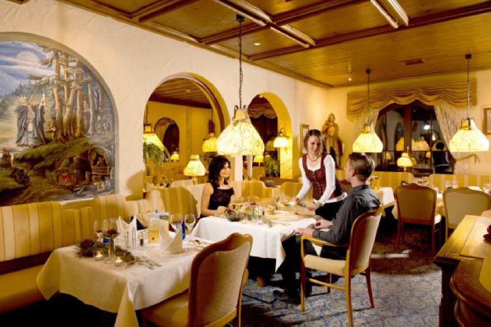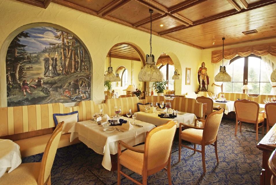 St. Georg Stube. Unser stilvolles á la carte Restaurant “St. Georgs Stube” wurde nach dem Hl. St. Georg, dem Bleibacher Schutzpatron, benannt. Die Heiligenfigur im Restaurant ist eine Leihgabe der Kirchengemeinde und stand lange Jahre in unserem Gotteshaus. Die Wandbilder aus der Sage vom Silberkönig stammen von dem Bleibacher Künstler Hans Schätzle. Der Raum bietet Platz für 50 Personen.