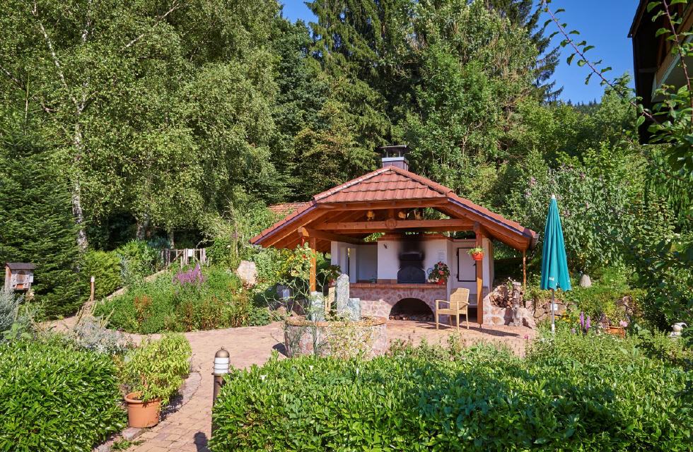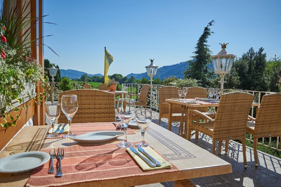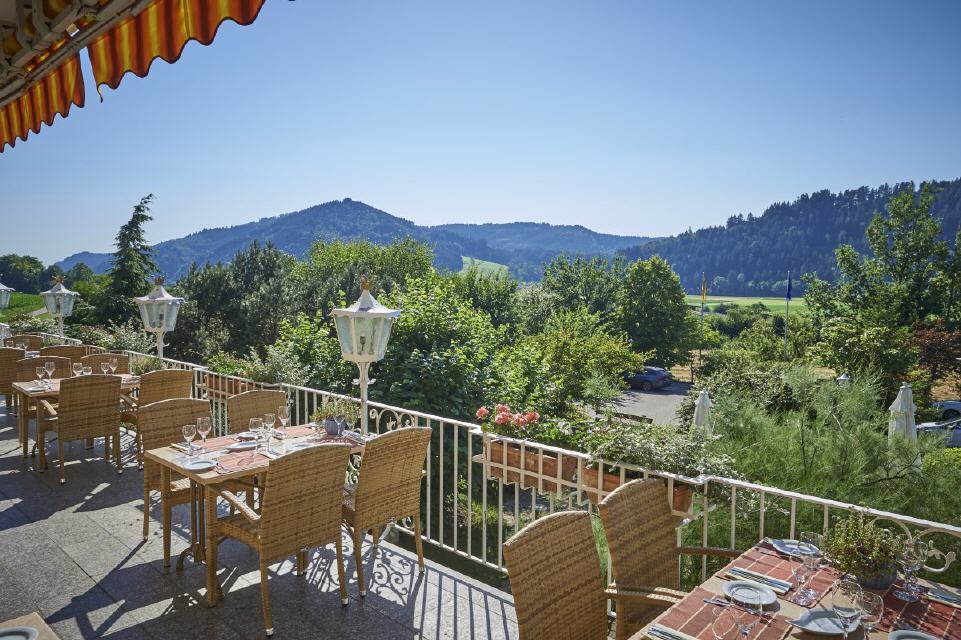 Terrasse mit Talblick. Auf unserer Sonnenterrasse mit der Kulisse unserer Berge und des Elztals im Hintergrund, genießen Sie die ursprüngliche Natur unter der wärmenden Sonne der Region. An den warmen Abenden empfehlen wir Ihnen die Faszination des Lichtergartens mit Blick auf die Franziskuskapelle. Bei geeignetem Wetter wird unsere Terrasse zum Restaurant. Hier finden 37 Personen Platz.