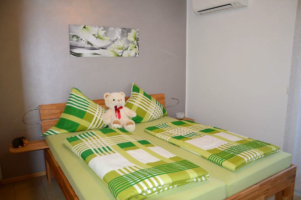 Sie verfügt über zwei separate Schlafzimmer mit jeweils einem 1,80 m breiten Doppelbett. Ein Schlafzimmer verfügt außerdem über ein zusätzliches Etagenbett. Der Wohn-/Essbereich ist mit einer Schlafcouch und Flachbildschirm sowie Essbereich und einer eingerichteten Küche ausgestattet. Das Badezimmer mit Dusche / WC. Für die kälteren Tage besitzen die Ferienwohnungen eine Fußbodenheizung und sind komplett gefliest und deshalb ideal für Allergiker. Haustiere sind deshalb nicht gestattet. Im Sommer steht Ihnen eine Klimaanlage zur Verfügung.