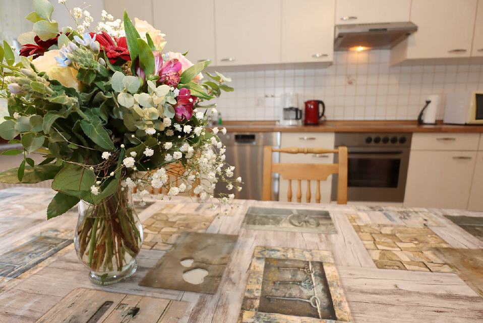 Die Wohnung ist behinderten- und seniorengerecht eingerichtet sowie für große Familien geeignet. Das Auto parkt direkt vor der Eingangstür unter einem Vordach. Somit ist die Wohnung immer trocken zu erreichen. Im Erdgeschoss ist das Bad mit einer Aufstehhilfe am WC und einer Sitzgelegenheit in der Dusche ausgestattet. Durch die Größe der Wohnung und zwei unabhängigen Sat-TV-Geräten (auf jeder Etage eines) sind Regentage kein Problem. Für einen entspannten Aufenthalt sorgen viele kleine Helfer. Zur Ausstattung gehören Waschmaschine, Hochstuhl, Kinderbett, Spülmaschine, Backofen mit Umluft, Mikrowelle, Spül-, Wasch- und Brotschneidemaschine.