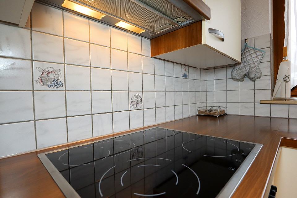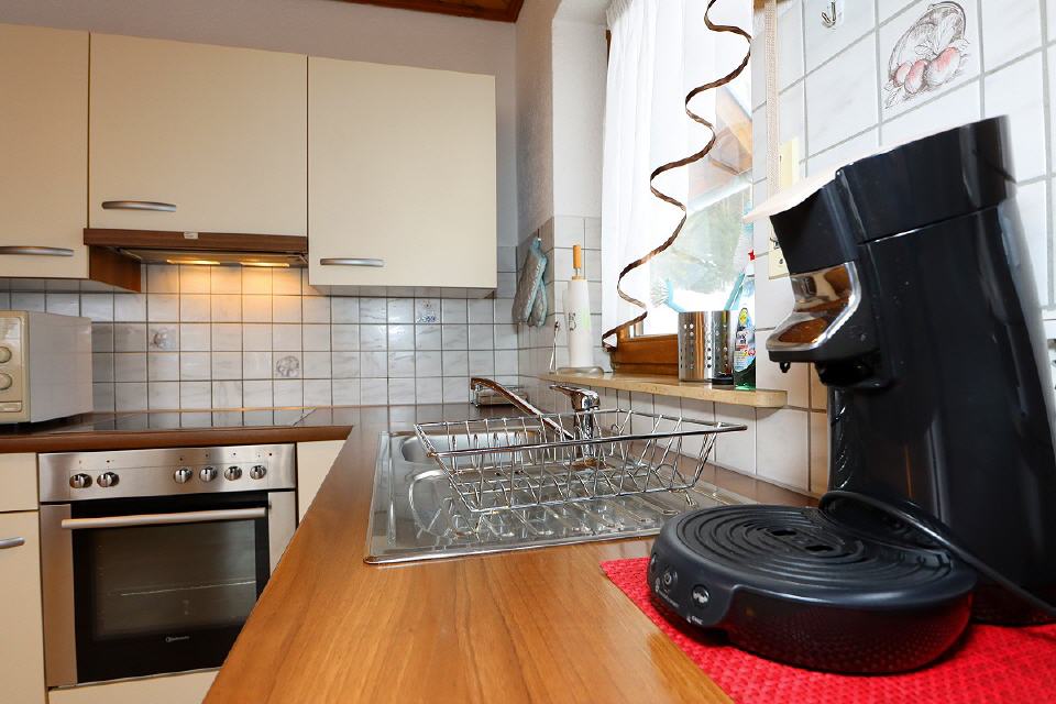 - Küche: große Einbauküche, Spülmaschine, Gefrierschrank, Ceran-Herd, Backofen, Mikrowelle, Kaffeemaschine, Eierkocher, Toaster, Wasserkocher, Handmixer, Küchenwaage, Essecke mit Bank und Stühlen, Zugang zum Balkon