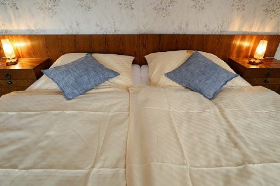 Die Betten sind bezogen, Hand- und Geschirrtücher sind vorhanden.