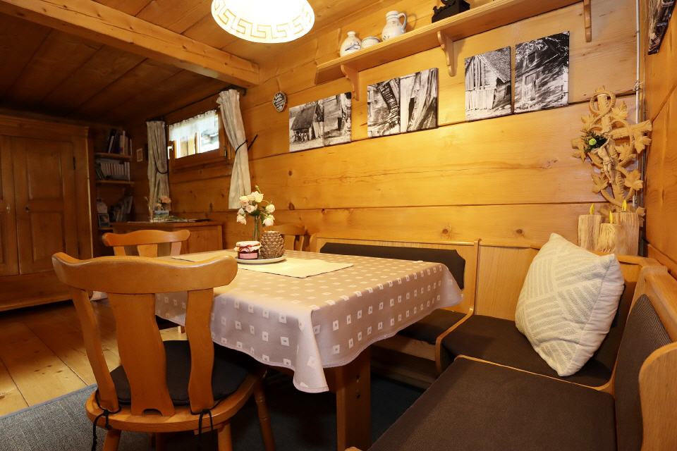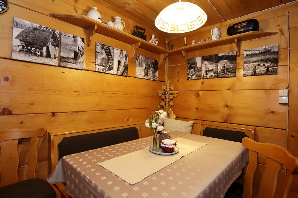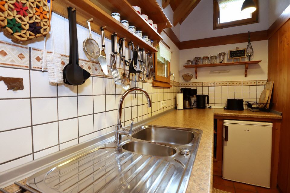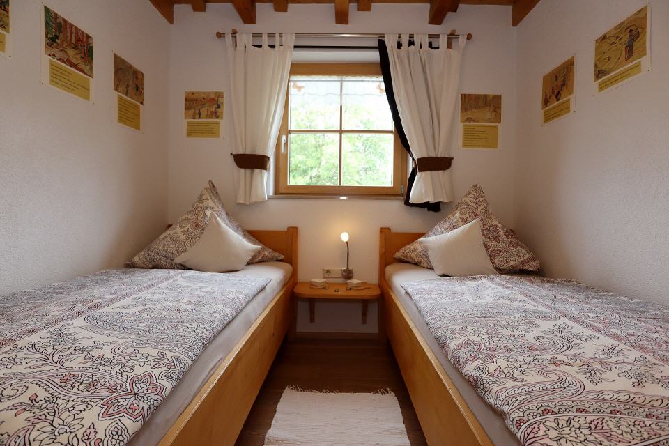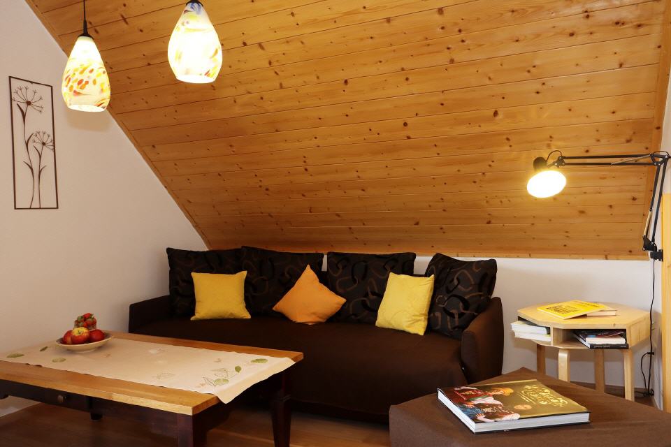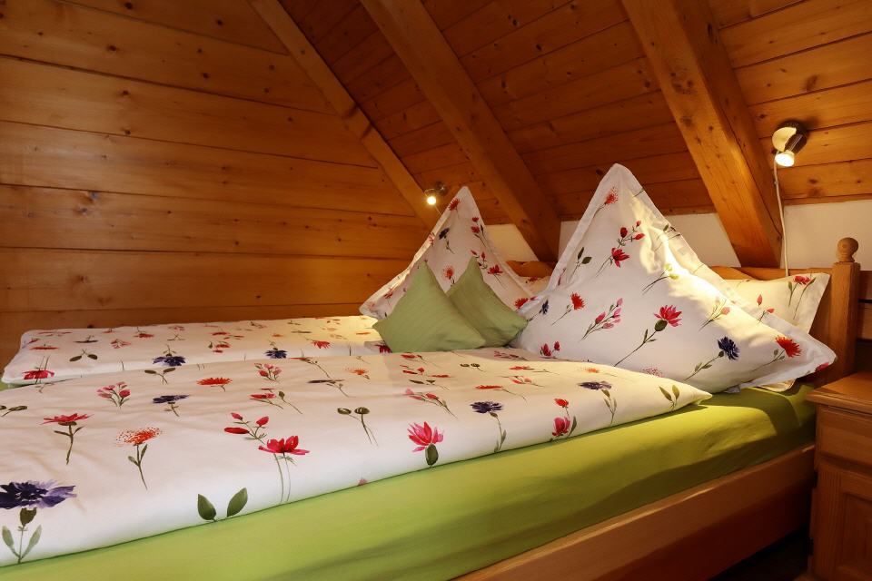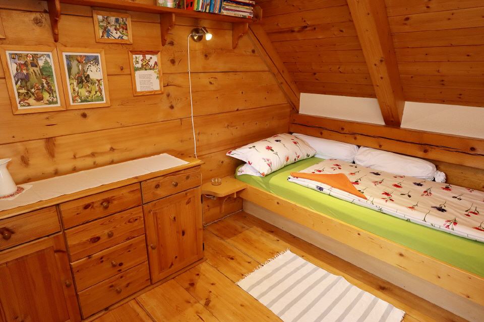 Das freistehende Ferienhäuschen bietet mit seinen 58 qm Wohnfläche Platz für 4 bis 6 Personen. Im unteren Stockwerk liegen die voll ausgestattete Küche sowie eine urige Wohn- und Essstube mit Sat-TV. Hier trifft sich die Familie zum gemeinsamen Essen und gemütlichen Beisammensein. Im oberen Stockwerk befinden sich neben dem Bad zwei separate Schlafräume. Ein Zimmer davon ist mit einem Doppelbett und das andere Zimmer mit zwei Einzelbetten möbliert. Vor dem Ferienhaus lädt eine große Liegewiese mit Freisitz und Grillmöglichkeit zum sonnenbaden, spielen und gemeinschaftlichen Essen ein.