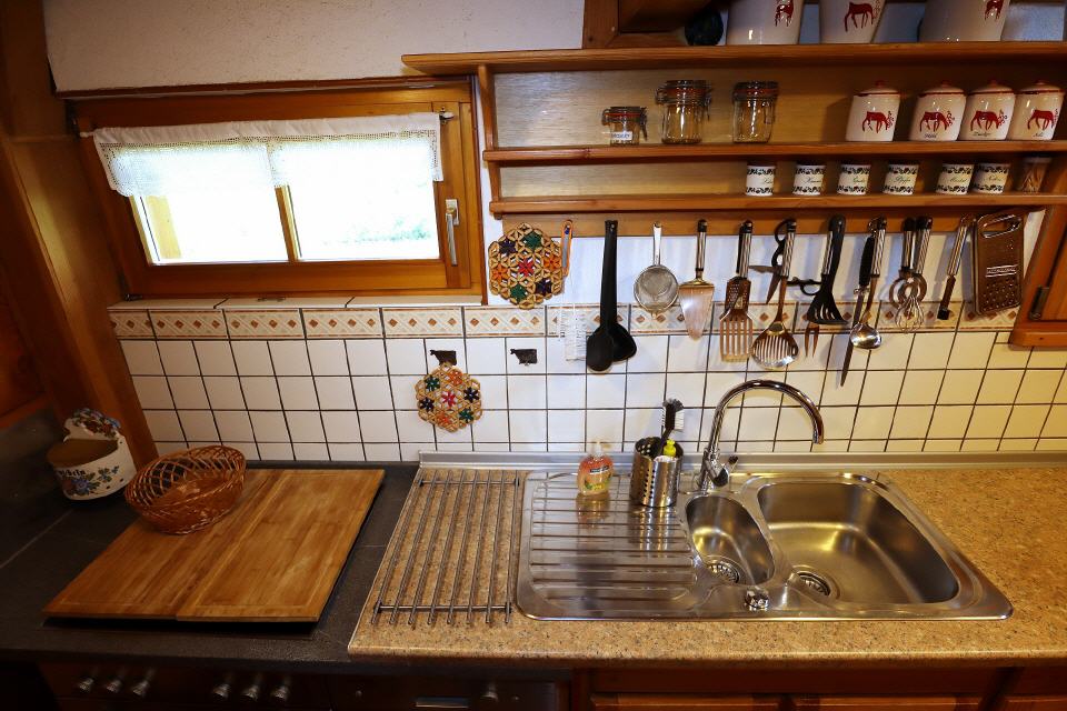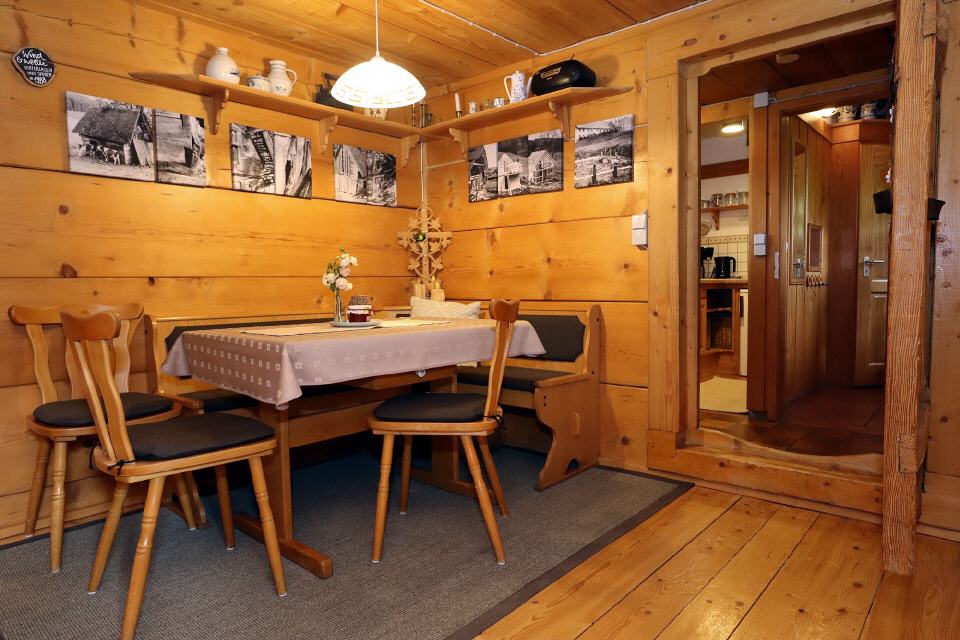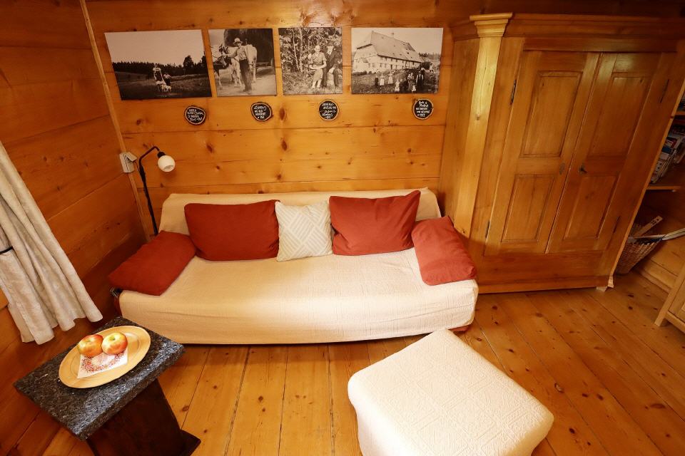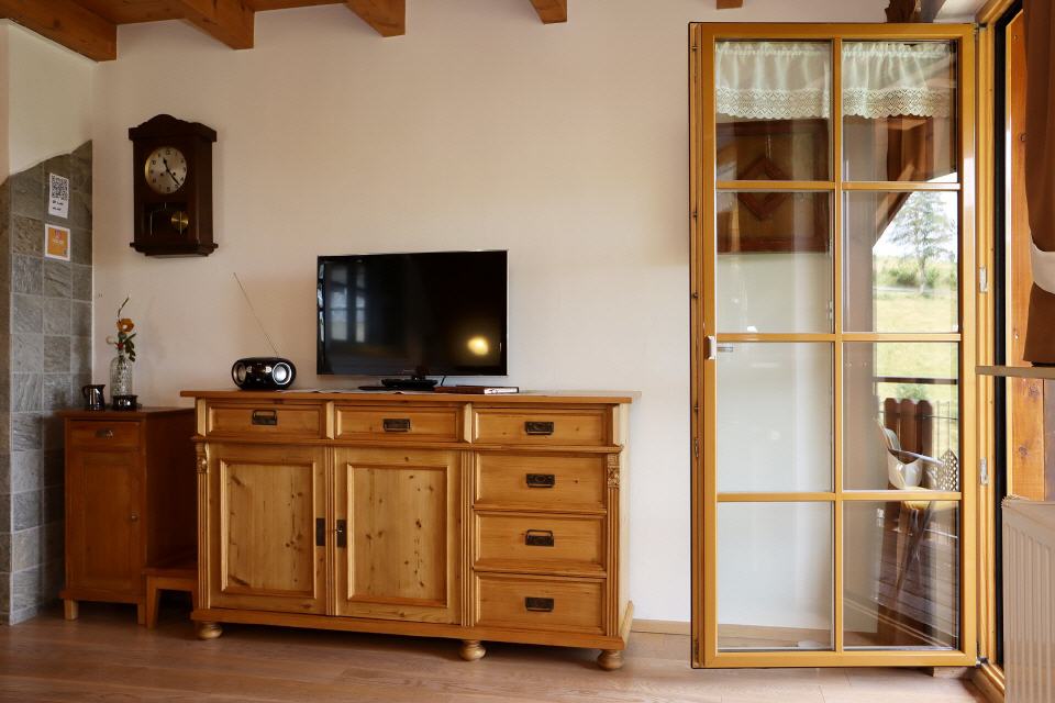Die gemütliche Inneneinrichtung wurde größtenteils aus hofeigenem Holz von örtlichen Handwerkern angefertigt. So lädt zum Beispiel die schöne helle Küche mit ihrer großen Essecke zum gemütlichen Beisammensein ein. Der behagliche Wohnbereich ist unter anderem mit einer großen bequemen Couch und einem Flachbild Sat-TV ausgestattet. Die Ferienwohnung verfügt über zwei separate Schlafräume. Ein Zimmer davon ist mit einem Doppelbett und das andere Zimmer mit zwei Einzelbetten möbliert. Das moderne Bad verfügt neben einer großen Dusche, WC, Kosmetikspiegel und Fön auch über eine Fußbodenheizung.