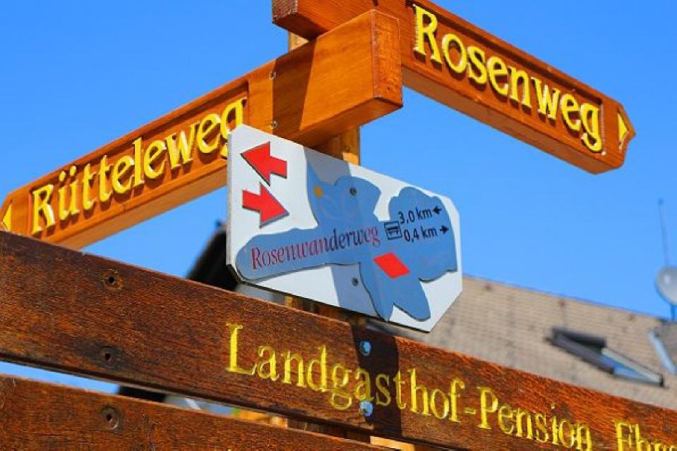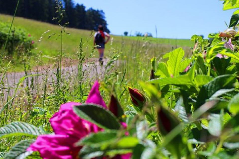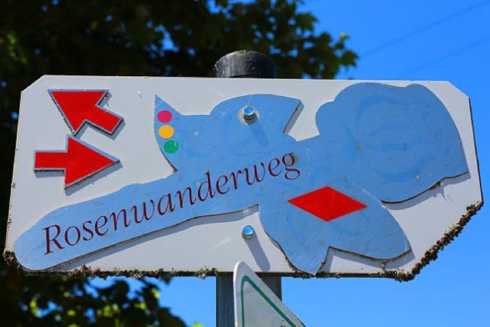 Anmerkung: Wer glaubt, am Rosenwanderweg Tausende Rosen zu entdecken, wird enttäuscht sein. Nur im Dorf Nöggenschwiel erfreuen Sie sich über ein Meer an Rosenstöcken; auf dem Wanderweg sind nur an einzelnen wenigen Stellen Rosen gepflanzt. Auch die versprochenen “Rosenstationen” mit Informationen über die Rosenarten sind eher spärlich. Im Grunde handelt es sich um einen ganz gewöhnlichen Rundwanderweg, der allerdings zu großen Teilen auf Asphaltstraßen geführt wird.