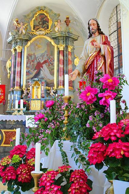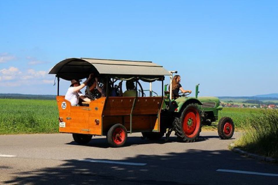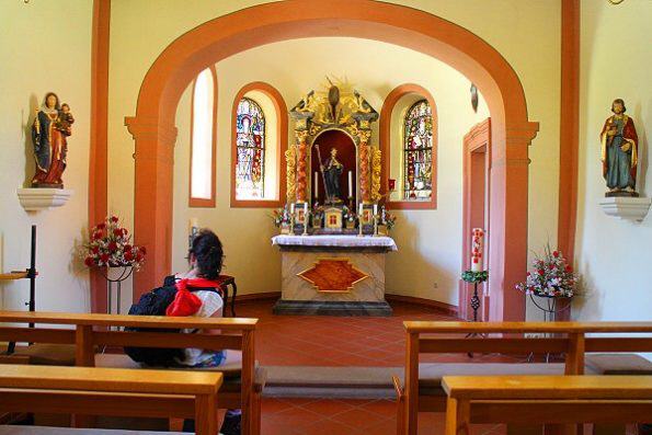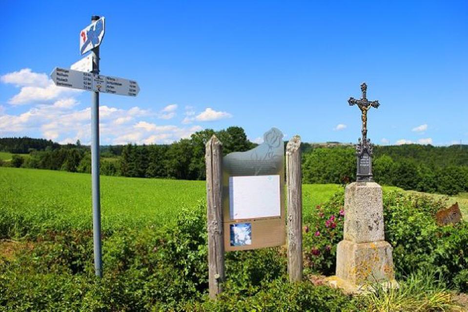 Dort verlassen wir den Rosenwanderweg, gehen zurück zum Mittelweg und folgen ihm links hinauf durch das anfangs bewaldete Heubachtal nach Heubach. Oberhalb des Weilers mündet der Mittelweg auf die Kreisstraße, der wir an der Apollonia-Kapelle (Zahnwehkapelle) vorbei zum Ausgangspunkt in Nögenschwiel folgen.