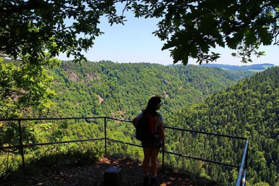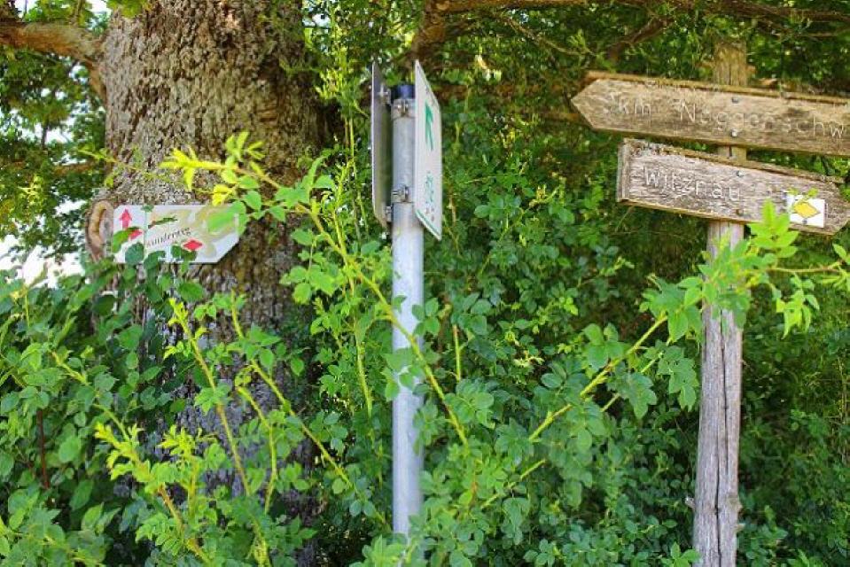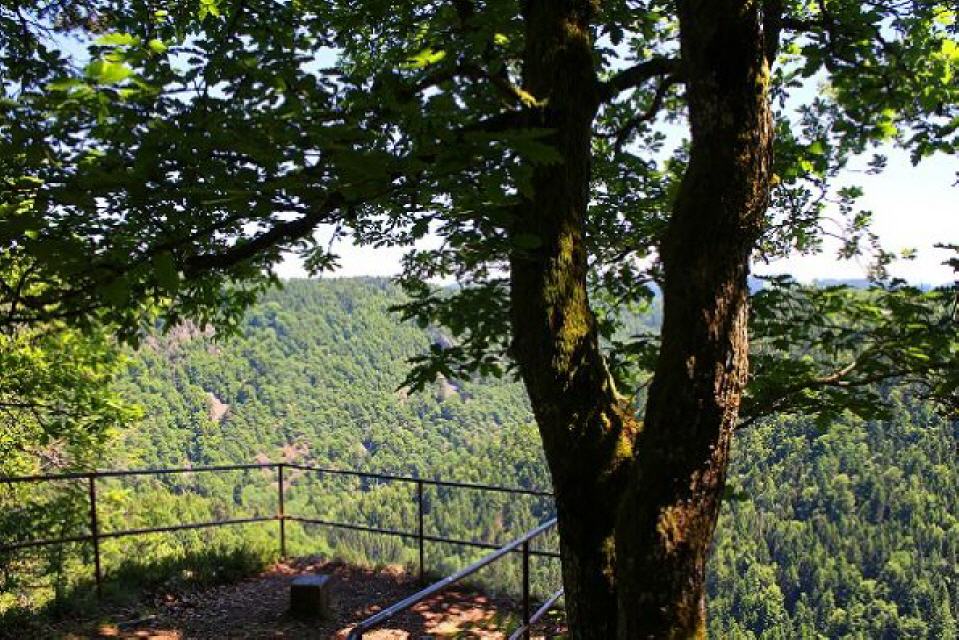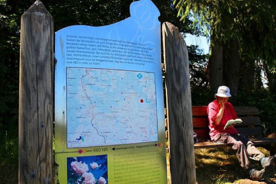 Vom Roseneck bei der Kirche in Nöggenschwiel führen die rote Rosenwanderweg-Markierung durch das schmucke Dorf, leiten aussichtsreich dem Wald zu und erreichen den Rastplatz am Hohfluhfelsen über der Schwarza. Von der Aussichsstelle aus bietet sich ein wunderschöner Panoramablick in das steile Schwarzatal mit dem Witznaustausee sowie flussabwärts zum Schlüchttal.